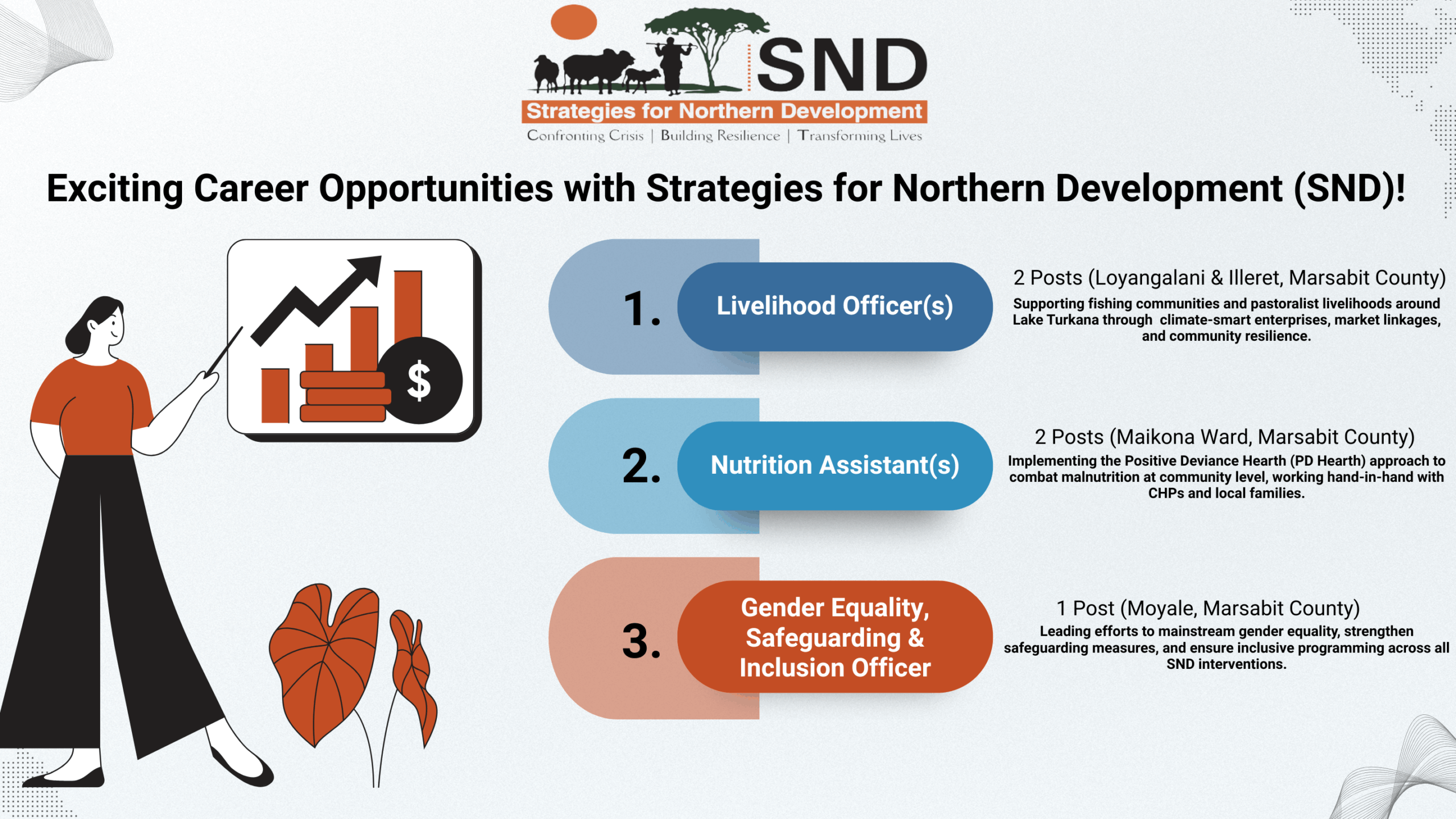 Strategies for Northern Development (SND) is committed to transforming lives among Nomadic Pastoralist Communities in Northern Kenya and Southern Ethiopia. Guided by our vision of building resilient communities where dignity thrives, we continue to expand our team with passionate professionals who share our mission.