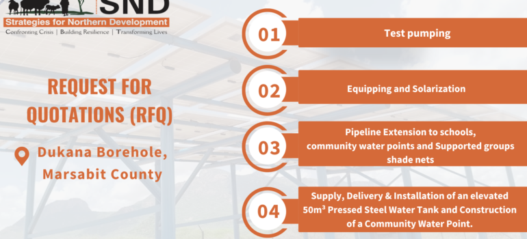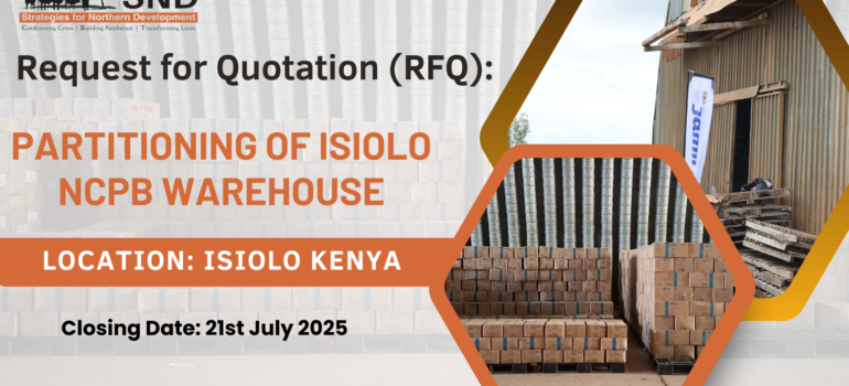 🛠 Request for Quotation (RFQ) Partitioning of Isiolo NCPB Warehouse Reference: SND -WFP/ ISL-NCPB/2025- 01 Closing Date: 21st July 2025 🏢 About Strategies for Northern Development (SND) Strategies for Northern Development (SND) is a local NGO working with nomadic pastoralist communities in Northern Kenya and Southern Ethiopia. Registered in 2007,